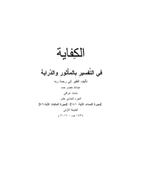 تحميل كتاب الكفاية في التفسير بالمأثور والدراية المجلد الثاني pdf كتاب الكفاية في التفسير بالمأثور والدراية المجلد الثاني تأليف عبد الله خضر حمد.. يُعد تفسير القرآن الكريم من الركائز الهامة والضرورية في فهم مقصود الله عز وجل، وهو أحد أهم الأبواب التي يلج منها طالب العلم لدراسة العلوم الإسلامية، فالأساس هو الوحي، وعليه ترتكز الدراسات الإسلامية ومن هنا جاءت أهمية التفسير. ومعلوم أن هناك مدارس كثيرة للتفسير والمفسرين، مثل المدرسة اللغوية والمدرسة الموضوعية والمدرسة الإعجازية ومدرسة تفسير القرآن بالقرآن، ومدرسة تفسير القرآن بالسنة النبوية وغيرها. والكتاب الذي بين يدينا، يتكون من 22 مجلدًا، وهو من أفضل كتب التفسير الحاوية للصحيح من الأقوال، وقد ابتعد المؤلف عن التكلف في توضيح وتفسير النص القرآني، واعتمد على الأحاديث النبوية والآثار التي يغلب عليها الصحة، وهو ينتمي إلى مدرسة فريدة، وهي مدرسة التفسير بالمأثور والدراية. ومن هنا نرى المؤلف يحتكم كثيرًا إلى اختيار المعروف من كلام العرب، ويعتمد على أشعارهم ومذاهبهم اللغوية والنحوية، ويتبع في التفسير مذهب السلف، ويضع نصب عينيه المأثور الثابت عن رسول الله صلى الله عليه وسلم وصحابته والتابعين رضي الله عنهم ليستعين به في تفسير القرآن، كما أنه تعمد أن يتجاوز بعض قصص المفسرين لطولها، فالكتاب مقصود أن يكون مختصرًا موجزًا. الجزء الثاني الذي بين أيدينا يبدأ بتفسير سورة البقرة، من البداية وصولًا إلى الآية رقم 60.